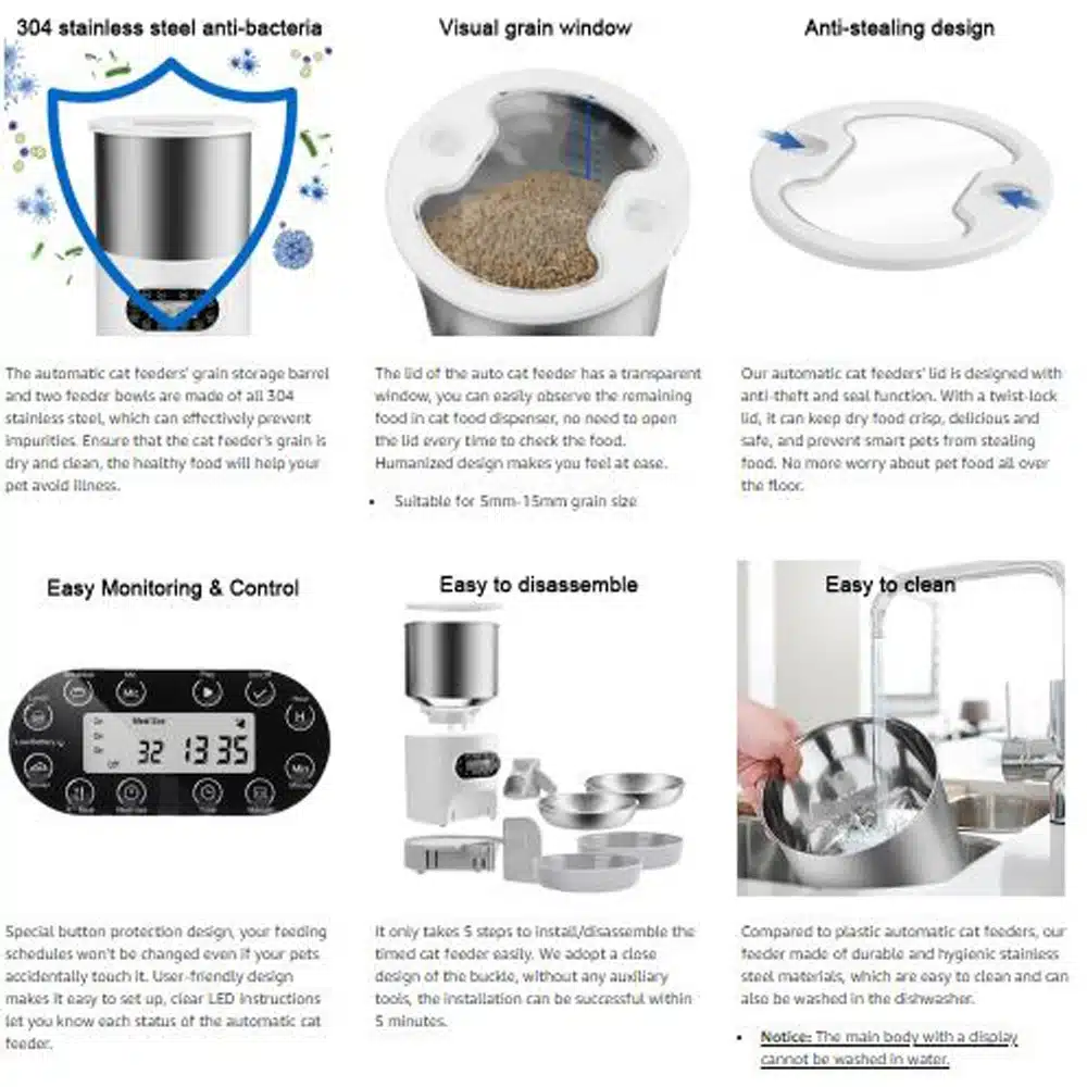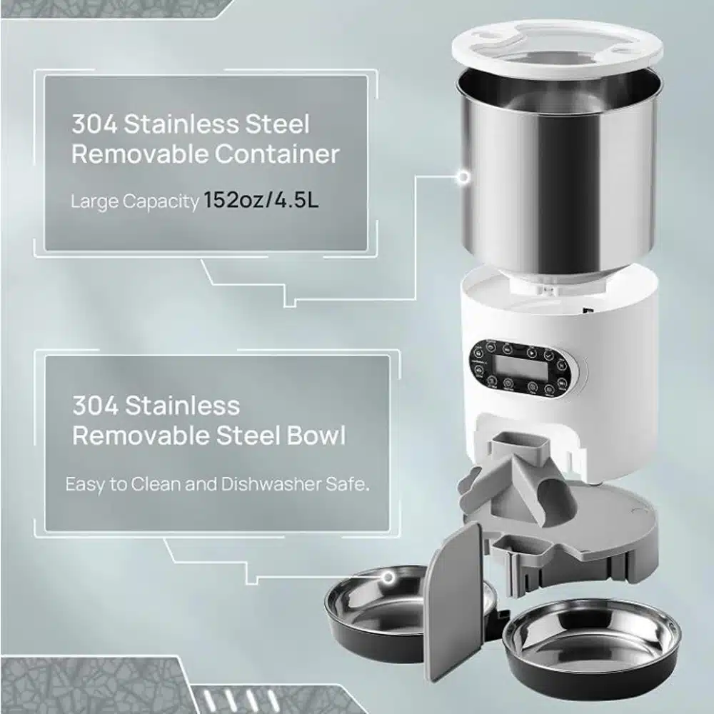 Simple and friendly operation-simple installation/disassembly + clear programming allows you to get started in 5 minutes. The 304 stainless steel material is easy to clean, and the food storage container that supports the automatic cat feeder and 2 bowls are washed in the dishwasher. (Note: the host with display cannot be cleaned)